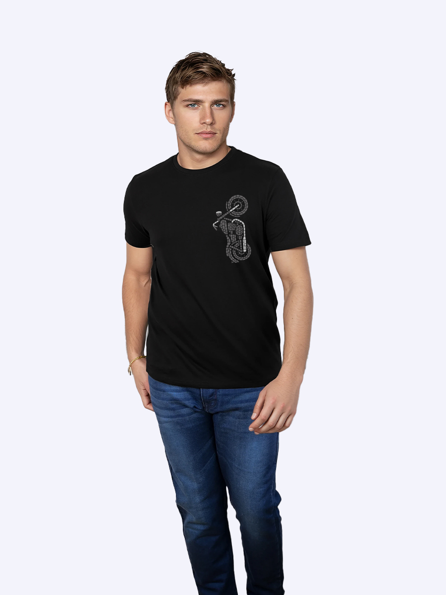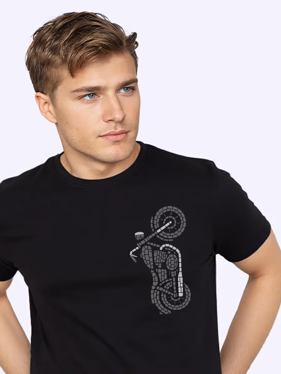 This bold black t-shirt features a sleek mosaic-style biker doing a wheelie, blending urban edge with artistic flair for modern streetwear enthusiasts.