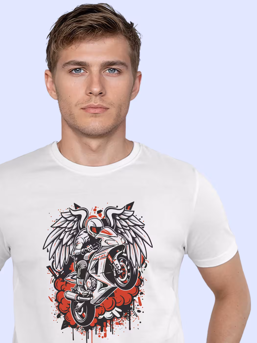 The Flying Biker T-Shirt For Men – Half Sleeve blends style and comfort with minimalist motorcycle-inspired graphics, soft cotton fabric, and a perfect fit for everyday rides or casual adventures.