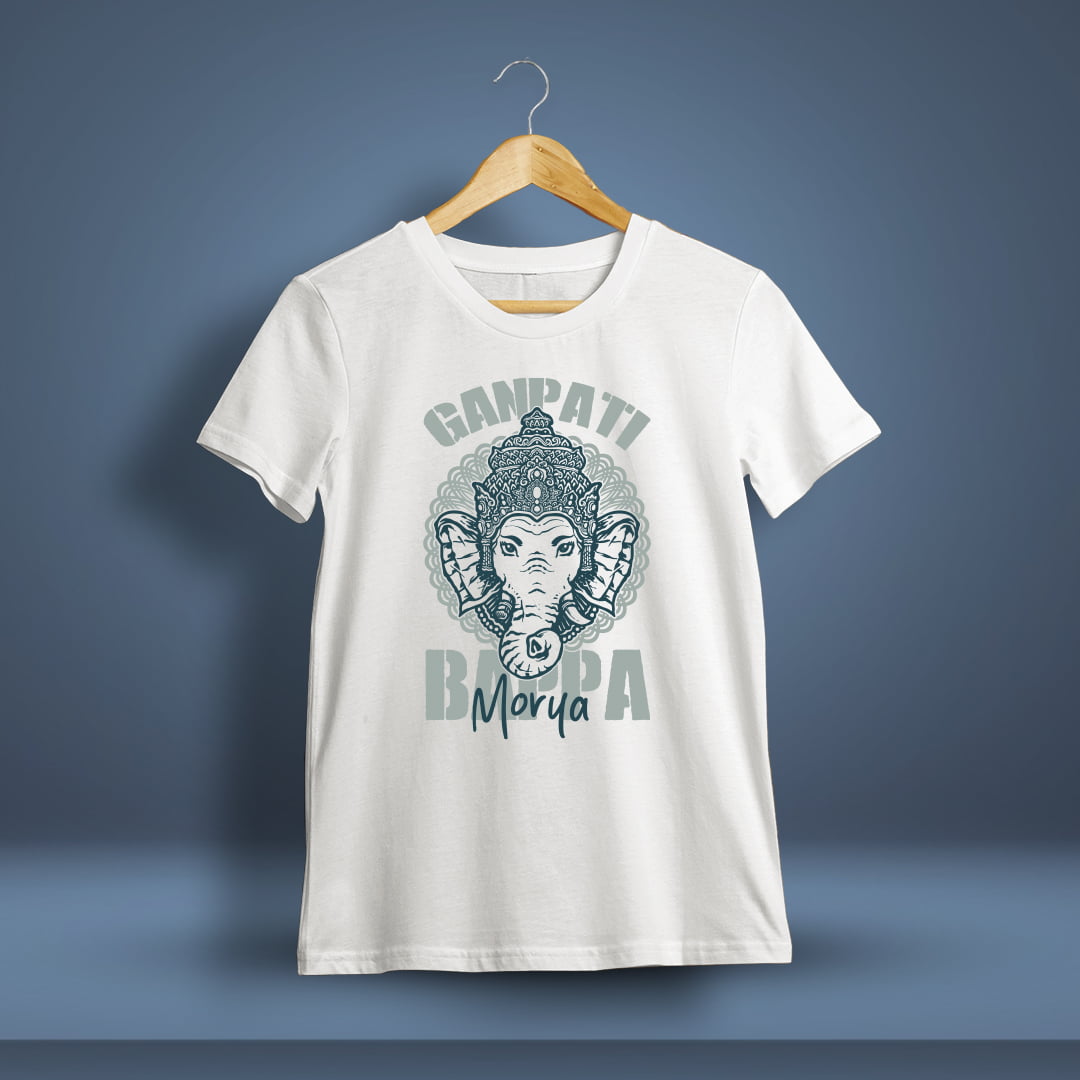 Ganpati Bappa Morya White T-Shirt showcases a vibrant Lord Ganesh design on crisp white fabric, perfect for blending tradition with a fresh, modern look.