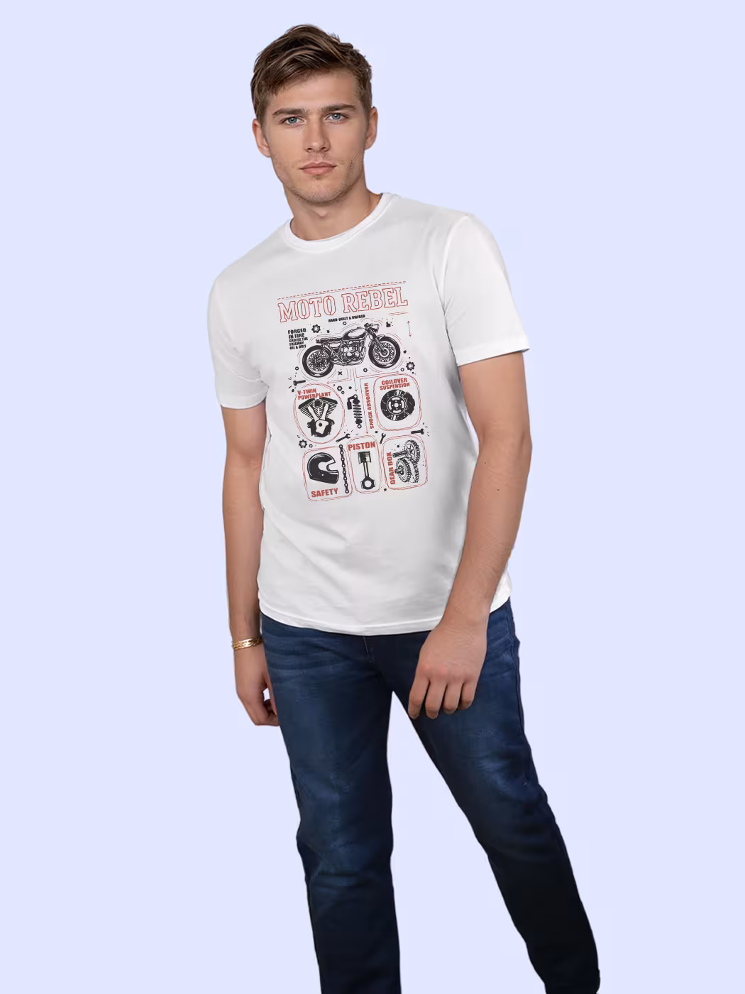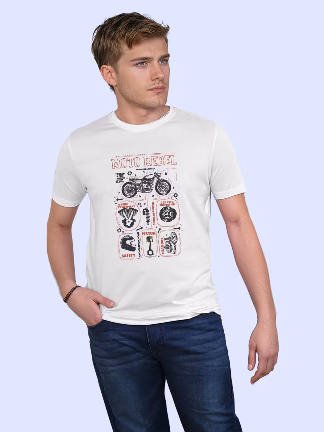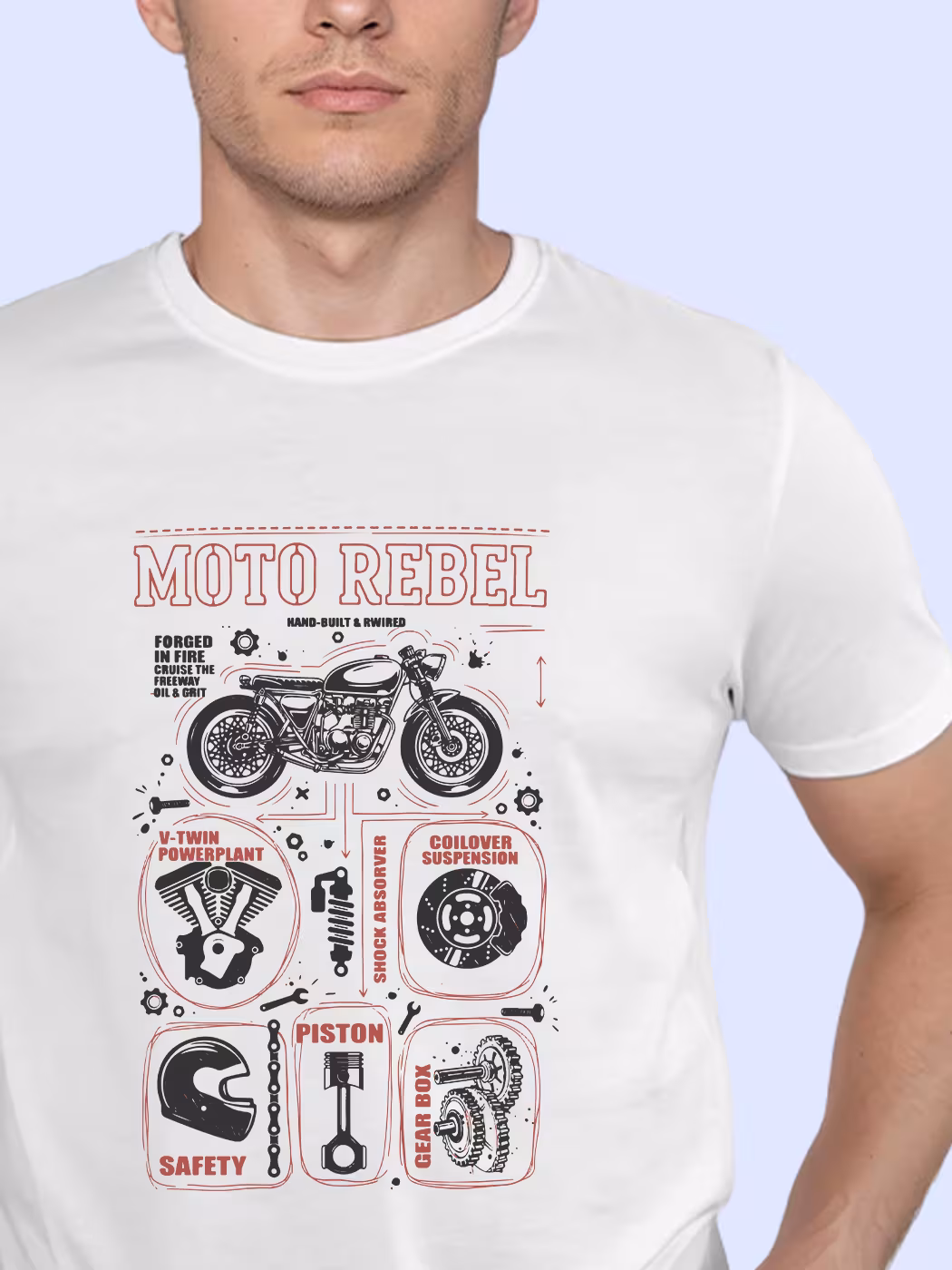 The Moto Rebel T-Shirt For Men – Half Sleeve blends style and comfort with minimalist motorcycle-inspired graphics, soft cotton fabric, and a perfect fit for everyday rides or casual adventures.