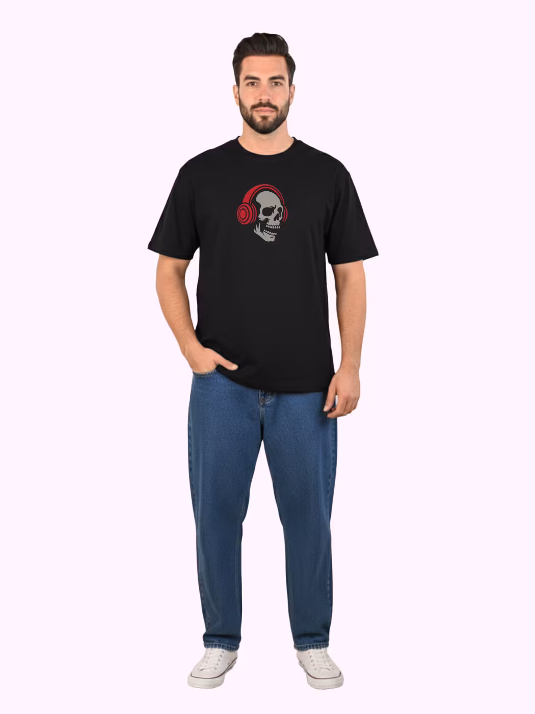 Rock your vibe with this oversized Music Skull T-shirt, blending music, art, and attitude in a bold design made for comfort and street-ready style.