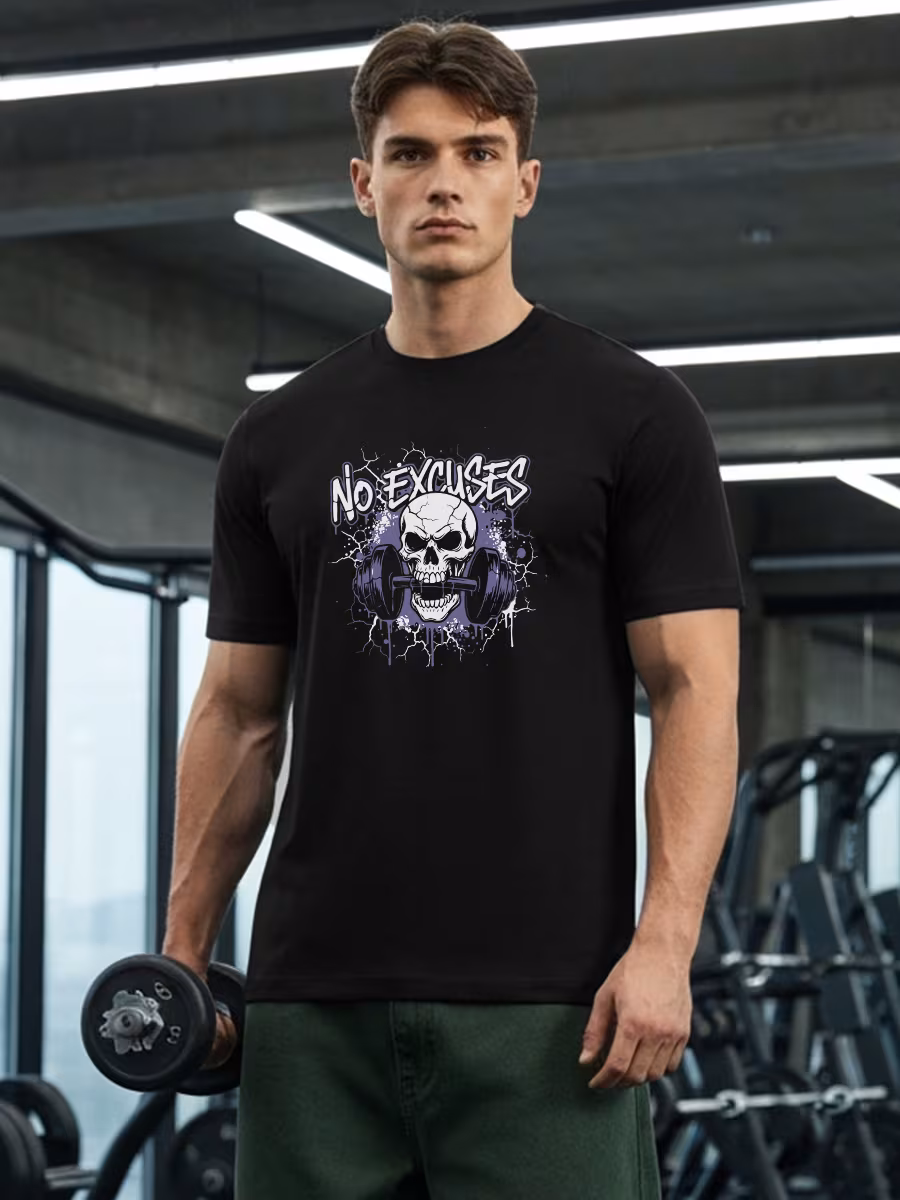No Excuses T-shirt fuels determination. Half sleeve, breathable comfort with bold motivational print. A must-have for fitness enthusiasts committed to discipline and strength.