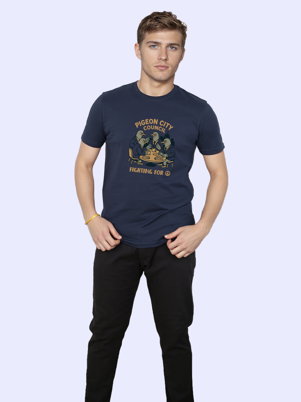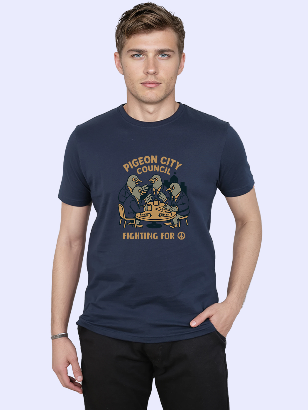 Urban street-culture half sleeve T-shirt for men with playful pigeon-inspired design.