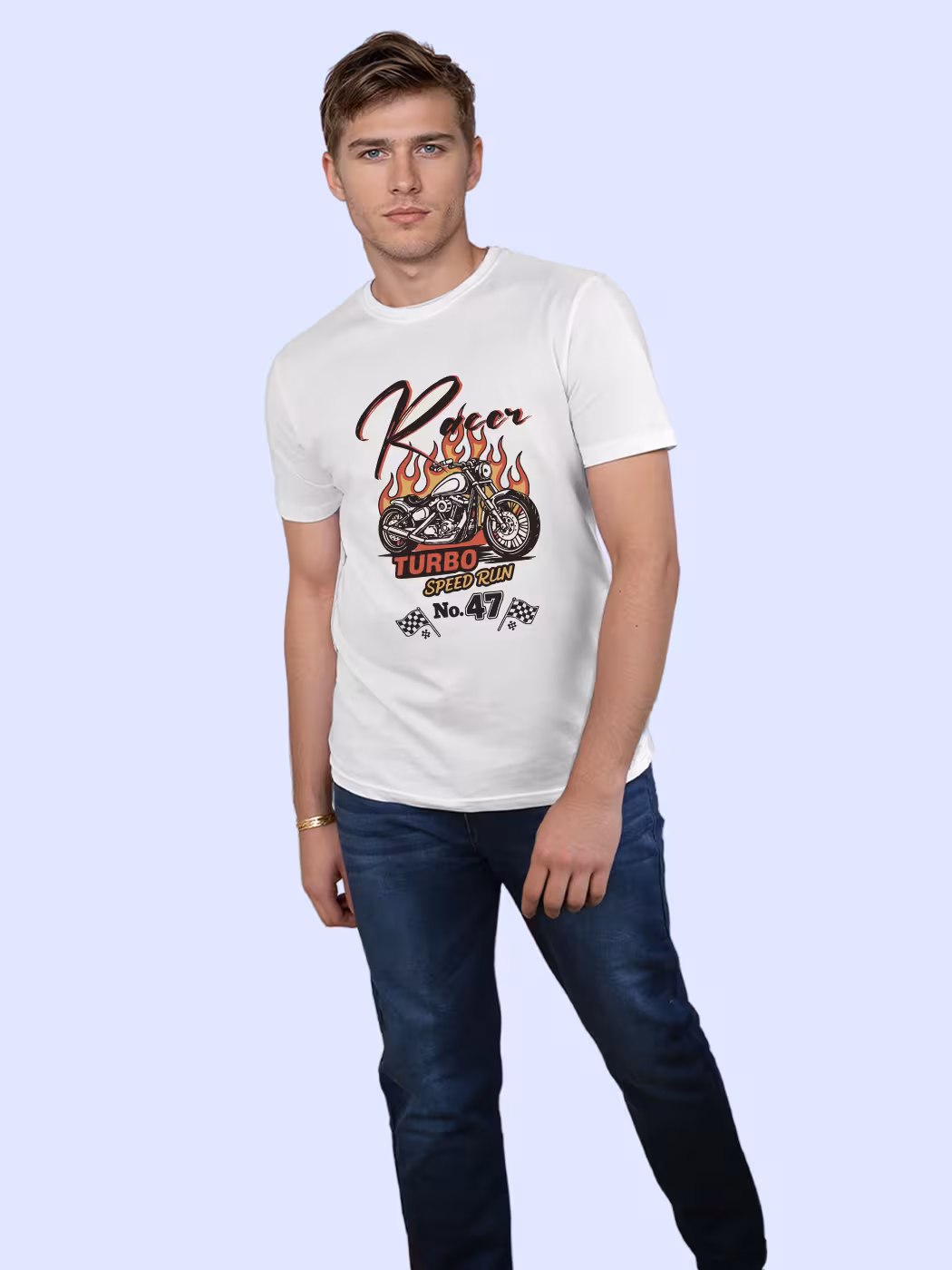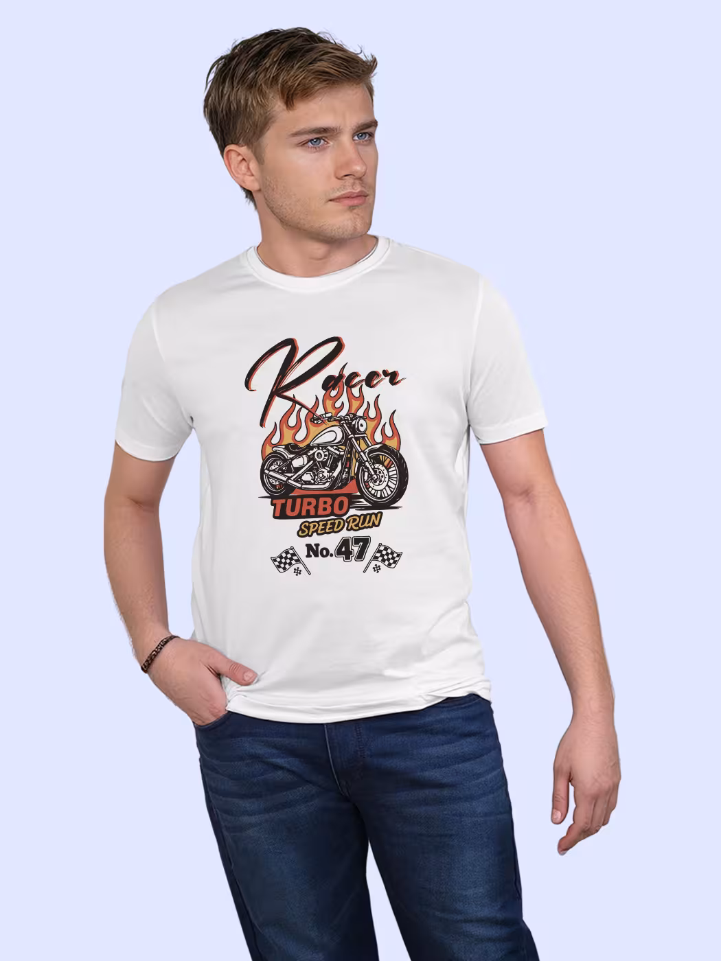 The Racer T-Shirt For Men – Half Sleeve blends style and comfort with minimalist motorcycle-inspired graphics, soft cotton fabric, and a perfect fit for everyday rides or casual adventures.