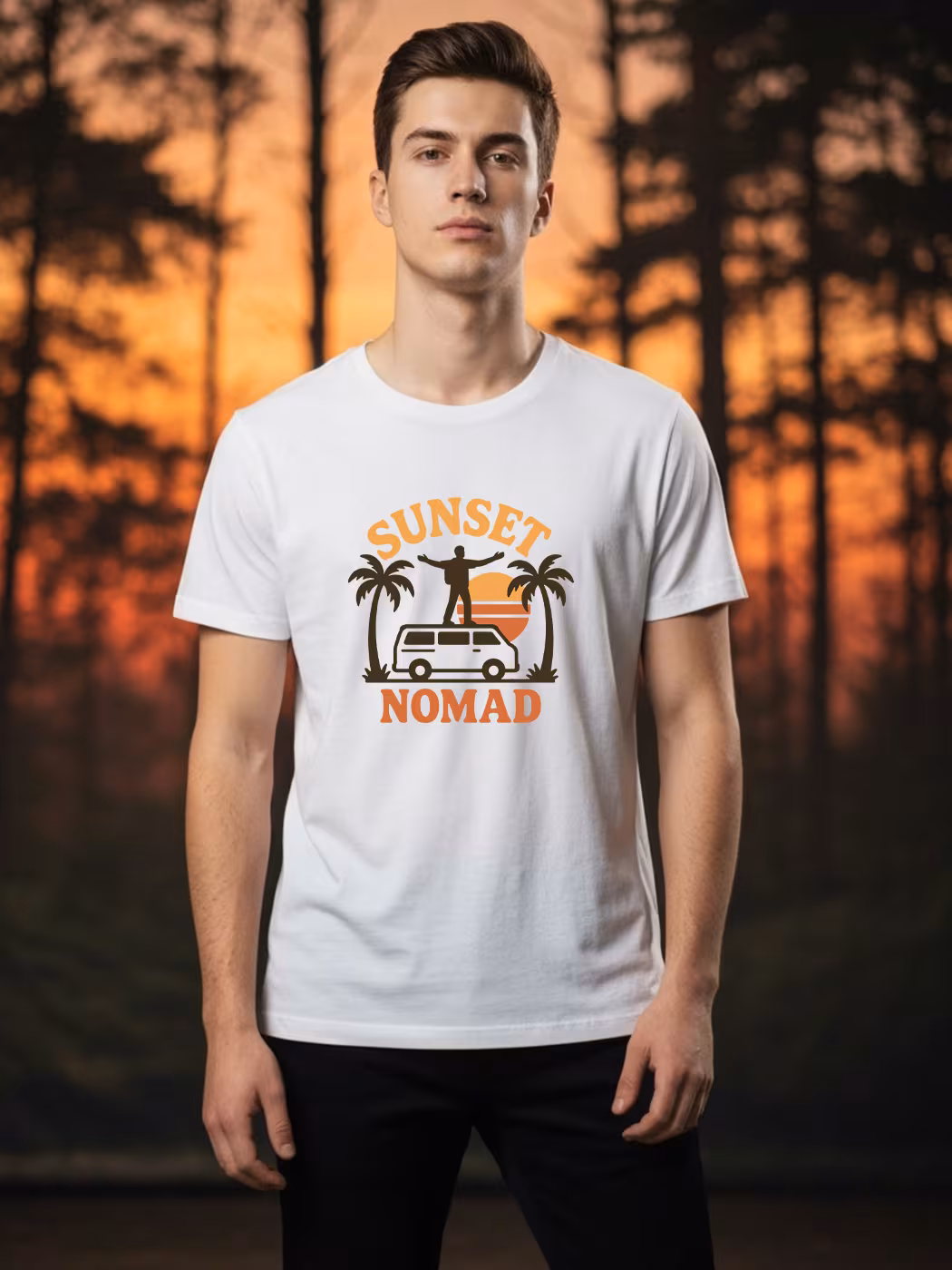 Sunset-inspired nomadic half sleeve T-shirt for men, perfect for beach trips and golden hour adventures.